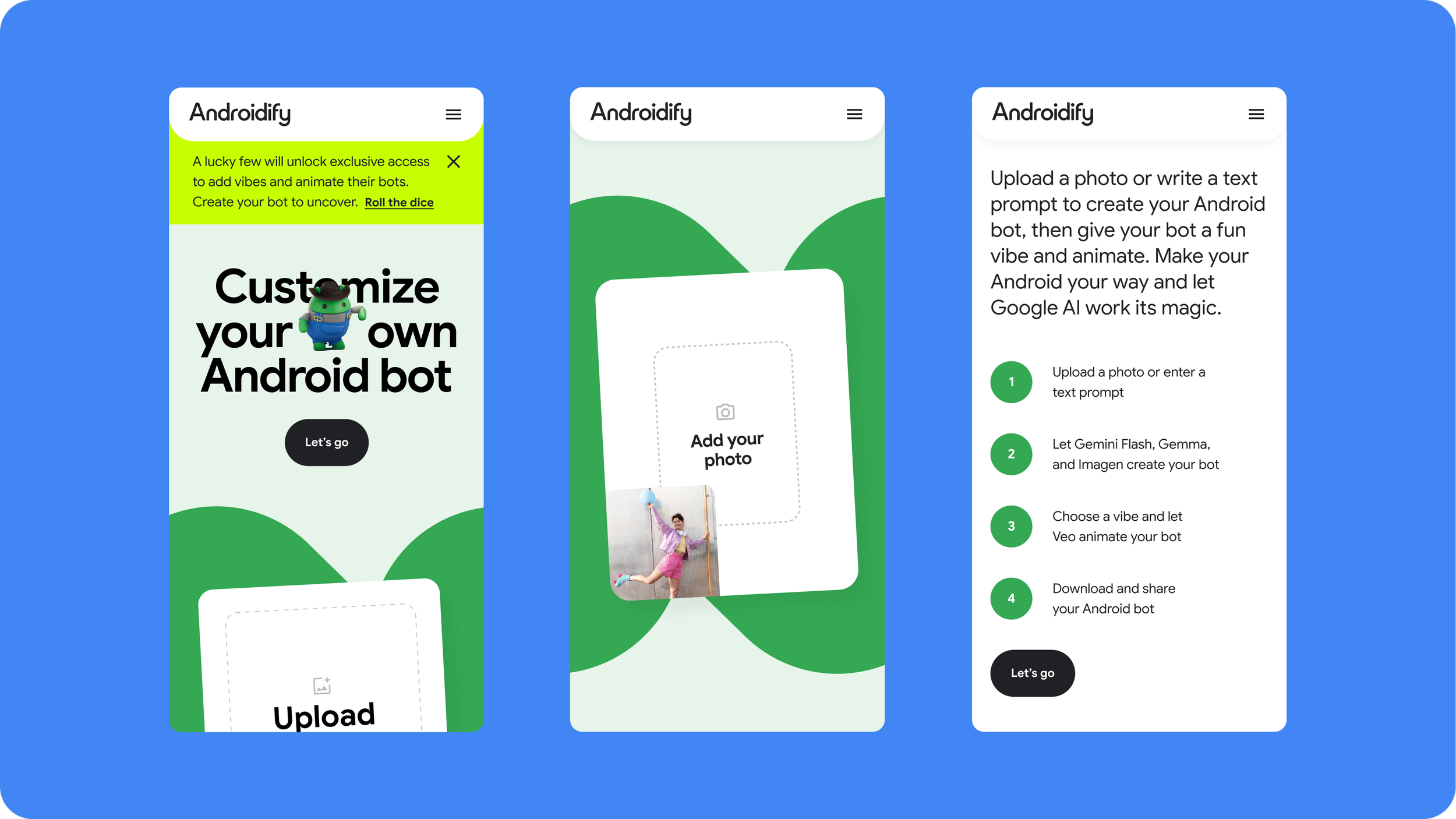 Androidify is an AI-powered online tool that allows users to upload a selfie or write a prompt, and customize their very own Android bot using the best of Google AI. Being that Android has always stood for self-expression, openly championing customization and inclusivity, Androidify served as a natural extension continuing to empower tech mavens to create a world of their making — only now with the magic of AI in their hands.